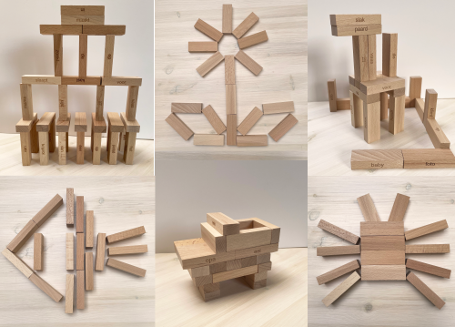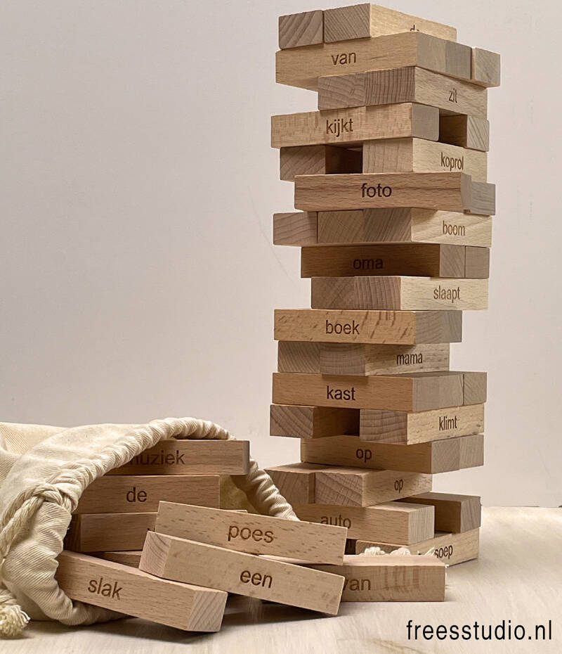 Op elk blokje een woord, zo kun je spelend bouwen en zinnen leren maken. Persoonlijke toevoegingen zoals namen, huisdieren etc ook mogelijk.